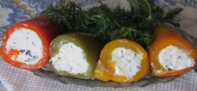 Затем набиваем перцы получившейся творожной смесью. Масса должна быть плотной.