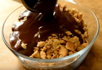 - Дайте смеси немного остыть. Добавьте в массу молотые орехи и молотое печенье.